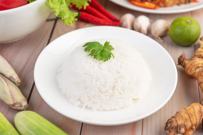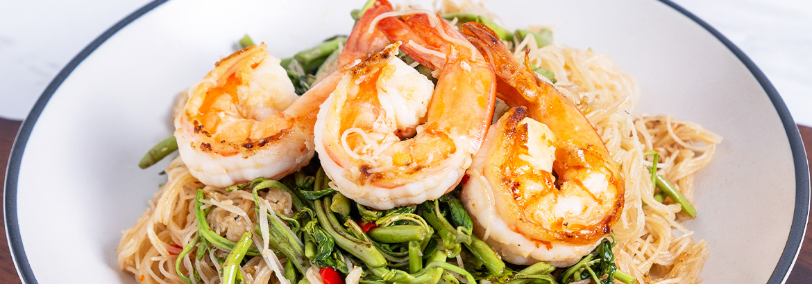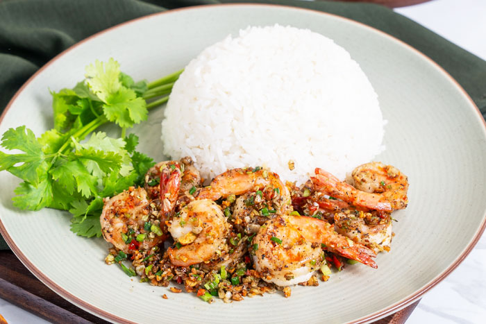 Stir-fried shrimps with garlic, salt, chili and steamed rice